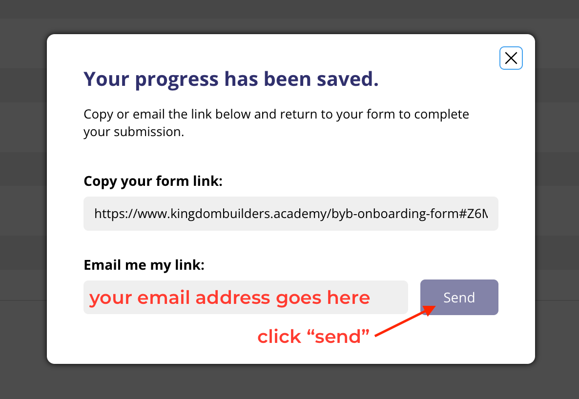 To continue with your saved form, go to your email inbox, open the email sent from the system and click the link provided.